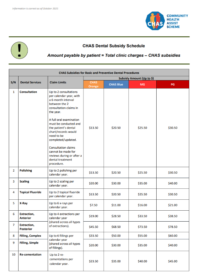 Please note that the dentist will need to make a clinical assessment to determine whether patients meet the CHAS claim guidelines for each dental procedure. Patients should speak with their dentists for more information.​